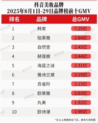 抖音美妆品牌2025年8月1日-29日品牌榜前十GMV