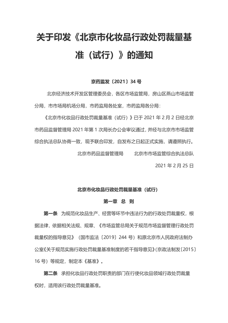 关于印发《北京市化妆品行政处罚裁量基准(试行)》的通知