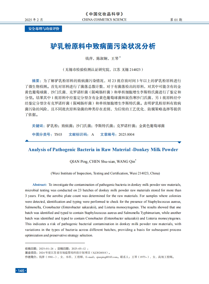 首页原料成分文献学术研究2025驴乳粉原料中致病菌污染状况分析