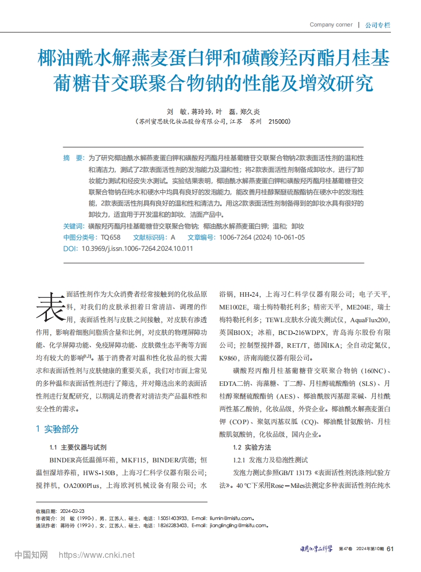 椰油酰水解燕麦蛋白钾和磺酸羟丙酯月桂基葡糖苷交联聚合物钠的性能及增效研究