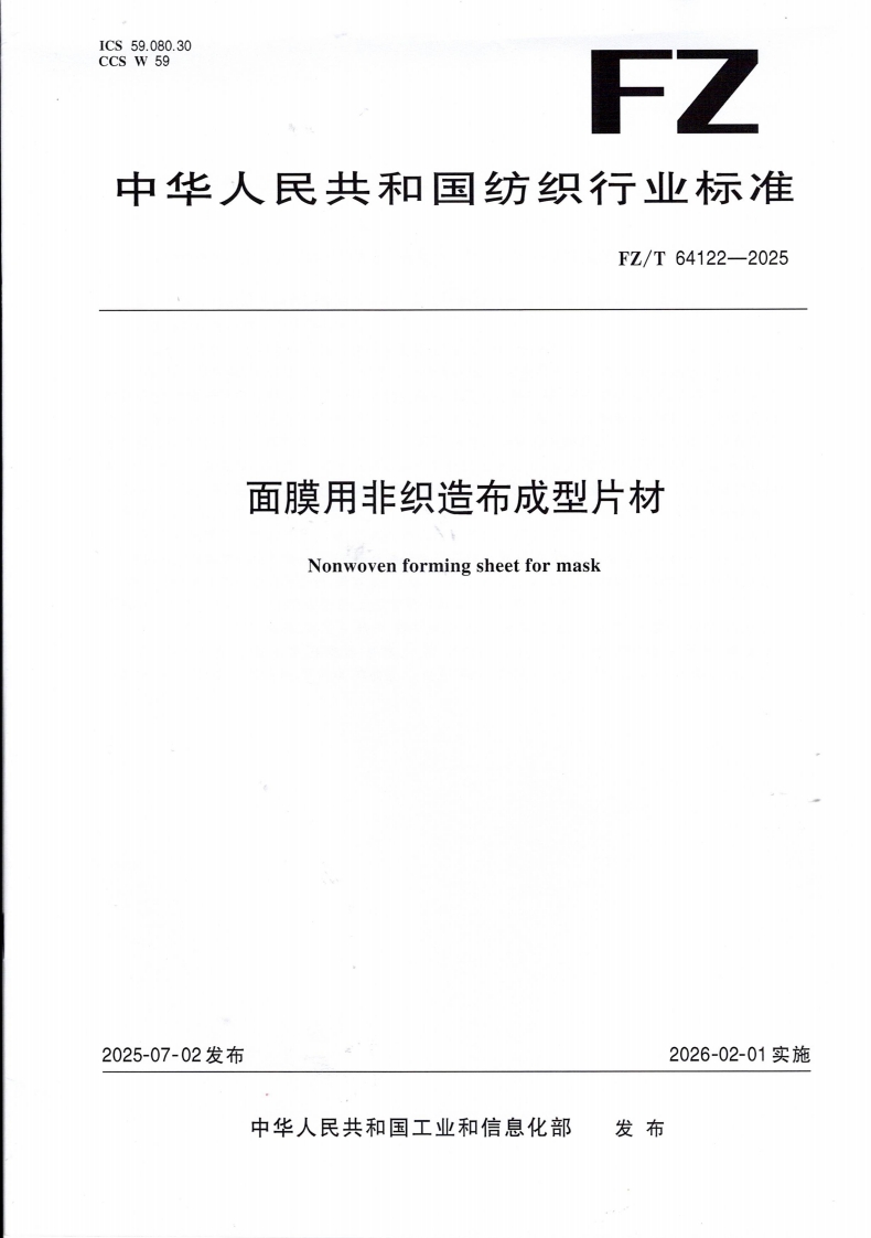 FZT64122-2025 《面膜用非织造布成型片材》 行业标准