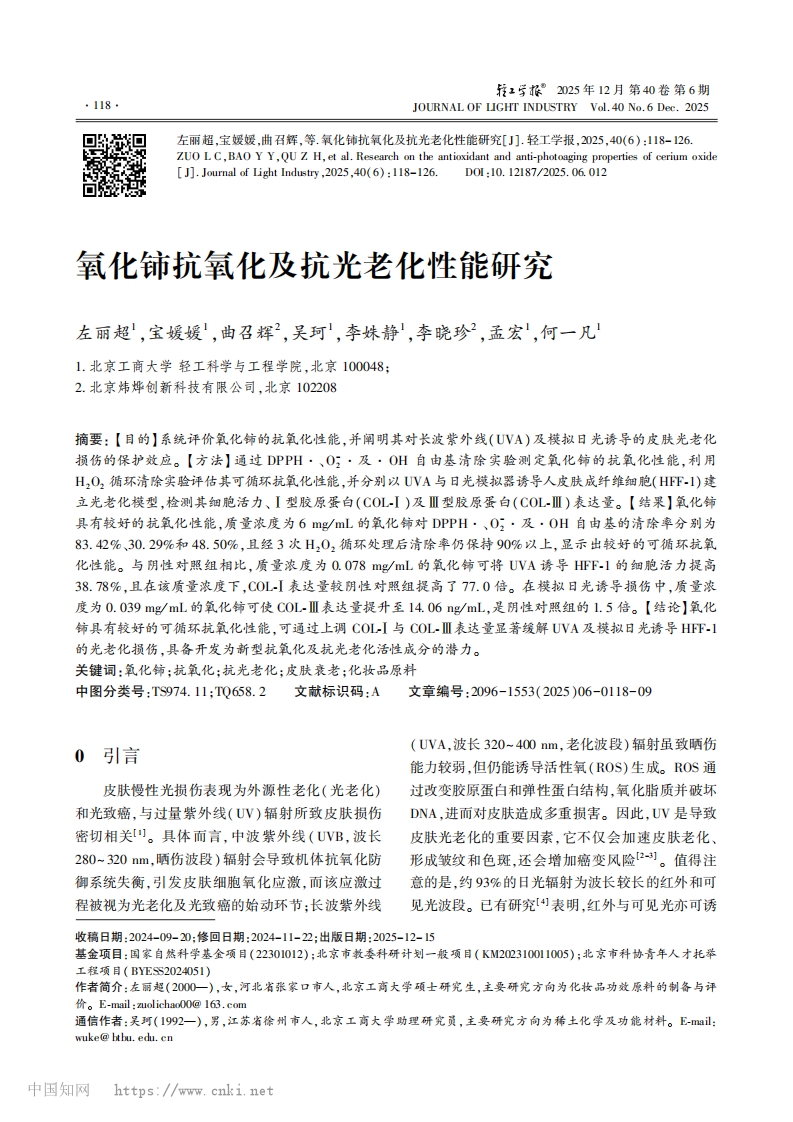 首页原料成分文献学术研究2025氧化铈抗氧化及抗光老化性能研究