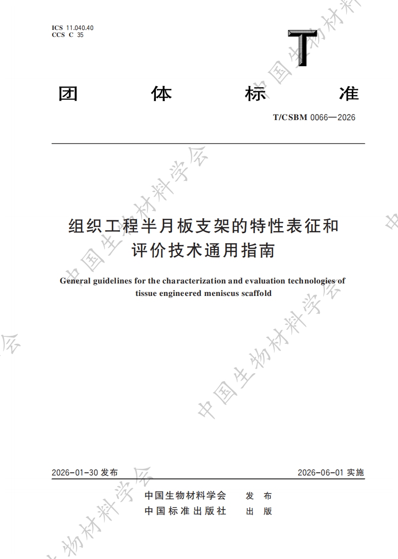 首页原料成分团体标准TCSBM 0066-2026组织工程半月板支架的特性表征和评价技术通用指南