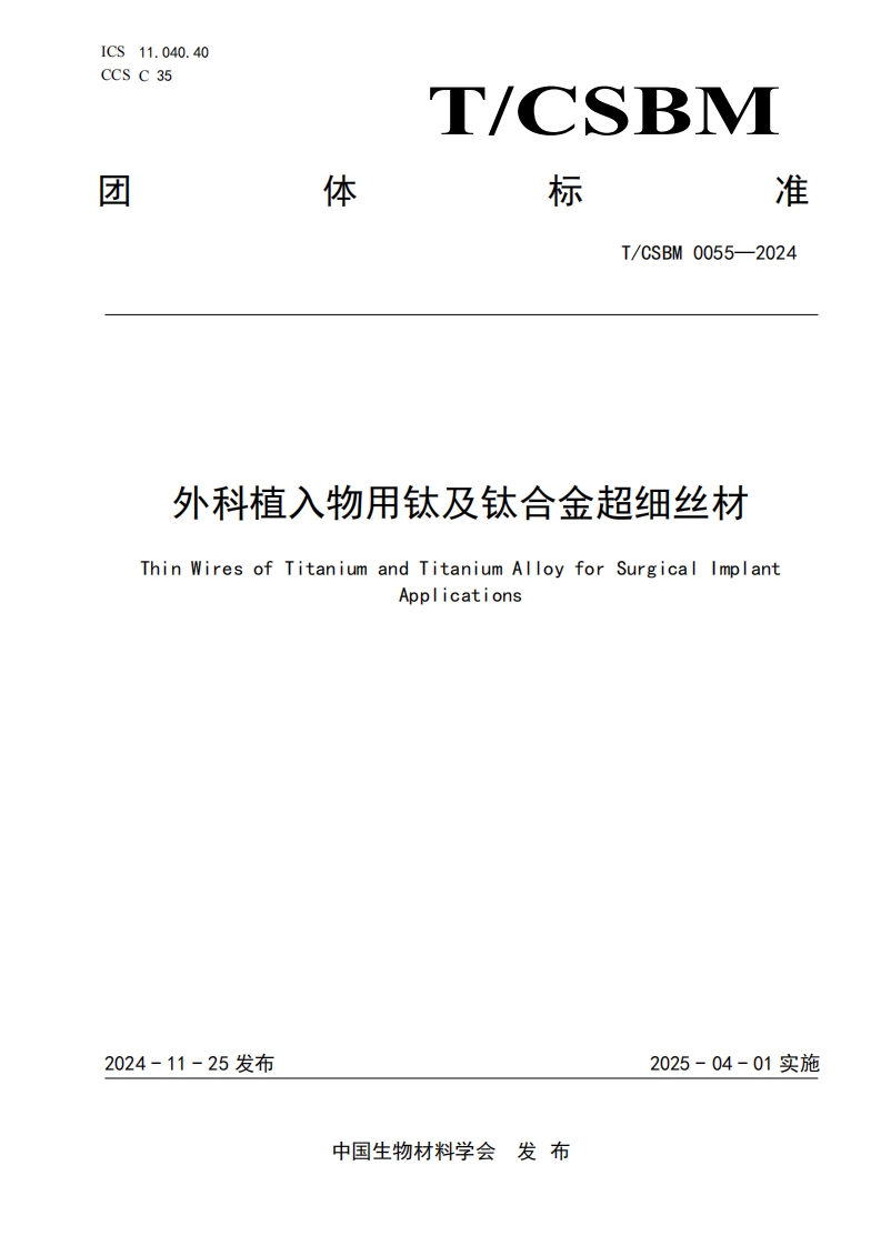 首页原料成分团体标准TCSBM 0055-2024 外科植入物用钛及钛合金超细丝材