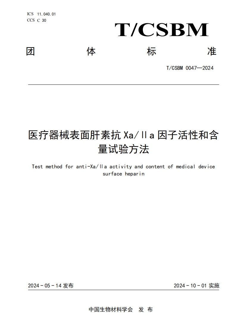 TCSBM 0047-2024 医疗器械表面肝素抗Xa ll a因子活性和含量试验方法
