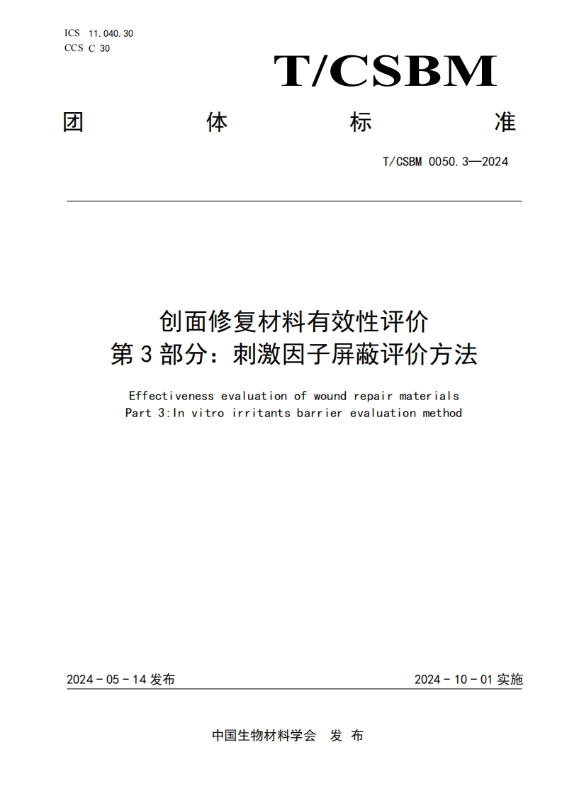 首页原料成分团体标准TCSBM 0050.3-2024创面修复材料有效性评价 第3部分:刺激因子屏蔽评价方法